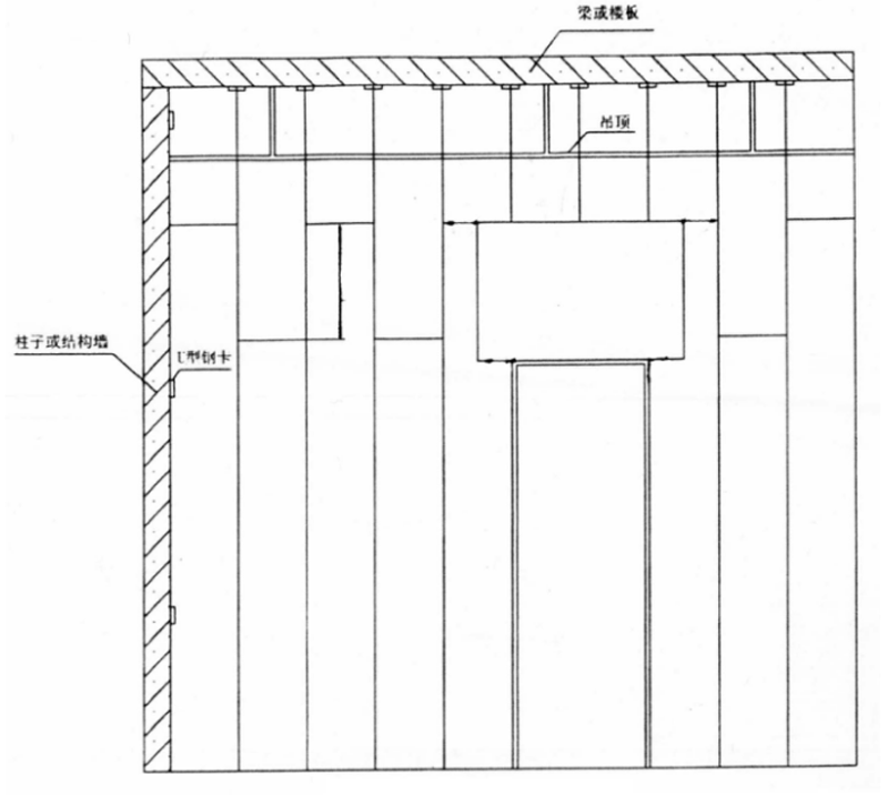 (4)鋼板卡固件固定應符合以下要求:a.條板隔墻與頂板、結構梁的接縫處,鋼卡間距不應大于600mm;b.條板隔墻與主體墻、柱的接縫處鋼卡可間斷布置,間距不應大于1m;c.